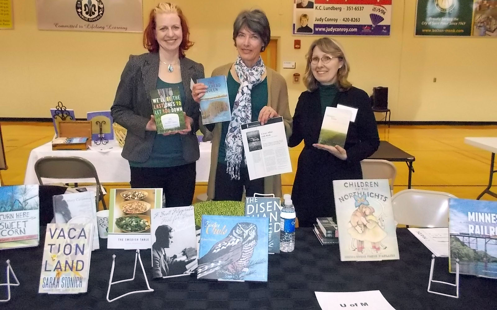 University of Minnesota Press authors at our table. From left: me, Sue Leaf (THE BULLHEAD QUEEN and A LOVE AFFAIR WITH BIRDS: THE LIFE OF THOMAS SADLER ROBERTS) and Gayla Marty (MEMORY OF TREES: A DAUGHTERS’ STORY OF A FAMILY FARM).