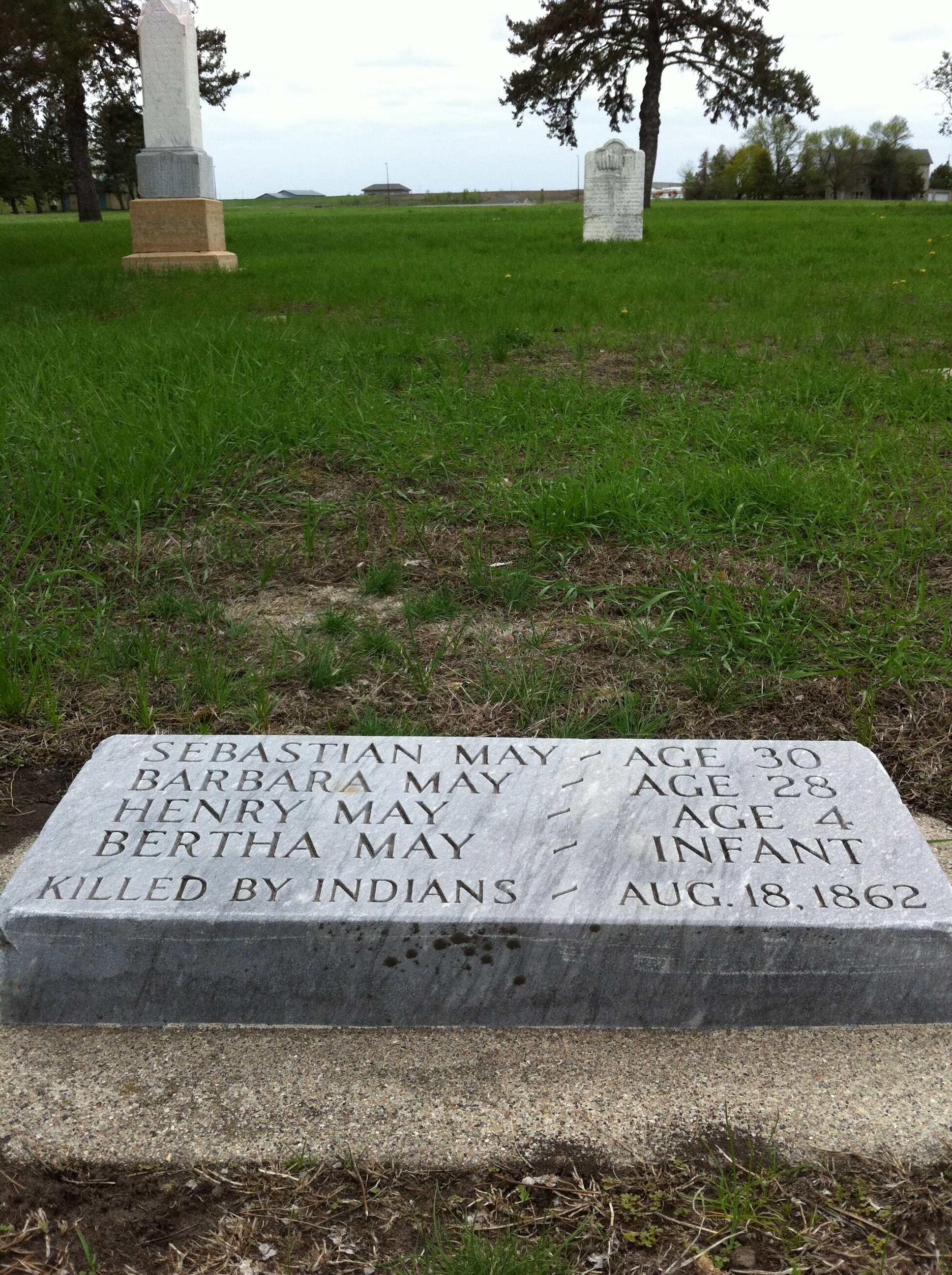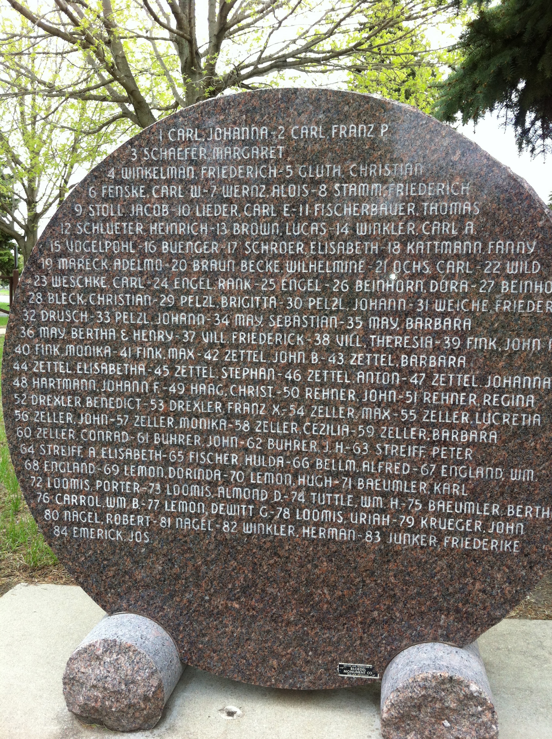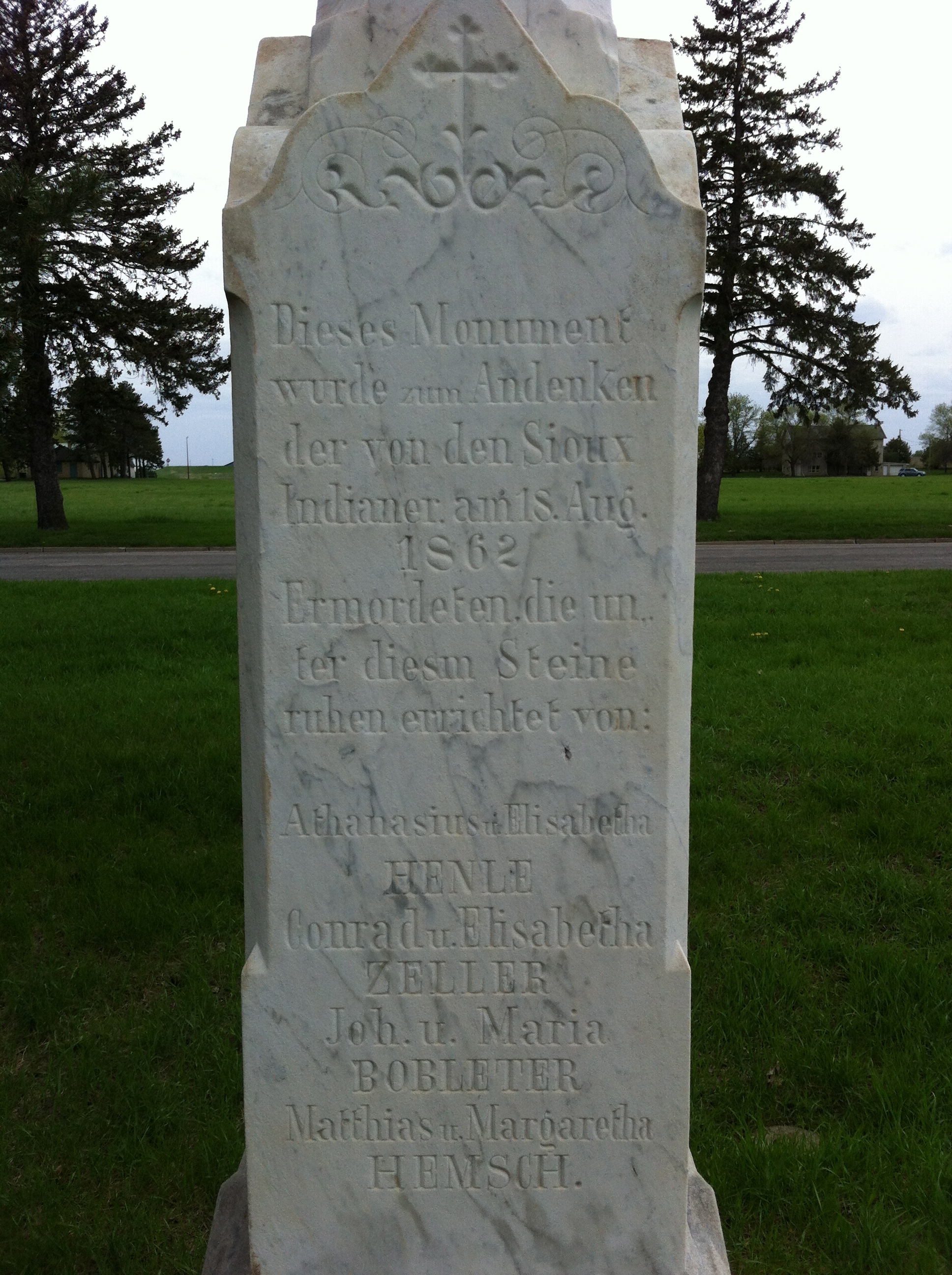 The German stone translates as: This monument was erected in memory of those who are laid to rest under this stone who were murdered by the Sioux Indians on 18.Aug.1862. Athanius and Elisabeth Henle, Conrad and Elisabeth Zeller, Johann and Maria Bobleter, Mattias and Margaretha Hemsch.