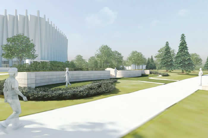 Photo courtesy of Gustavus Adolphus College. This is an architectural drawing of the memorial garden at Gustavus. Christ Chapel is in the background.