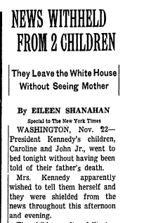 I was browsing the November 23, 1963 edition of the New York Times and saw this article. We know so well the images of the Kennedy kids at the funeral, but I don’t remember hearing about them on the day of the assassination. What a task it must have been for everyone to keep the news from them.