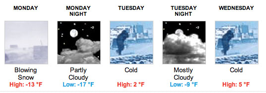 Minnesota is experiencing some of its coldest temps in almost 20 years. My phone is showing -20 degrees F right now, with windchills between -40 and -50. Meteorologists literally are calling this a “polar vortex.”