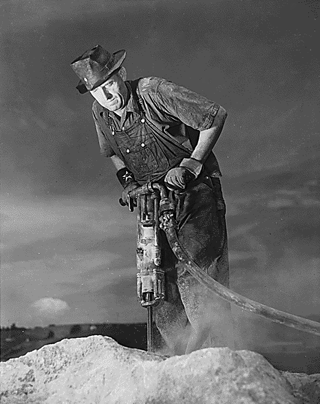 If this were Dale, he’d be wearing a parka and hat and gloves and probably Carhartt overalls. Source: Franklin D. Roosevelt Presidential Library and Museum. From http://en.wikipedia.org/wiki/File:TVA_Douglas_Dam_jack_hammer.gif