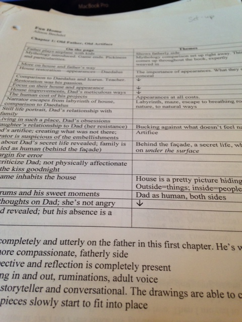 Every time I read this book I’m still in complete awe. I consider it a perfect memoir. I haven’t read it for a while. I figured now that I’m done with the memoir, I can find other books to serve as models for my current project, a biography. But now that I read my notes again, I realize that it’s time for another Fun Home read. It’s a perfect memoir, yes, but it’s also a perfect story, and that’s what I’m still doing — writing a story.