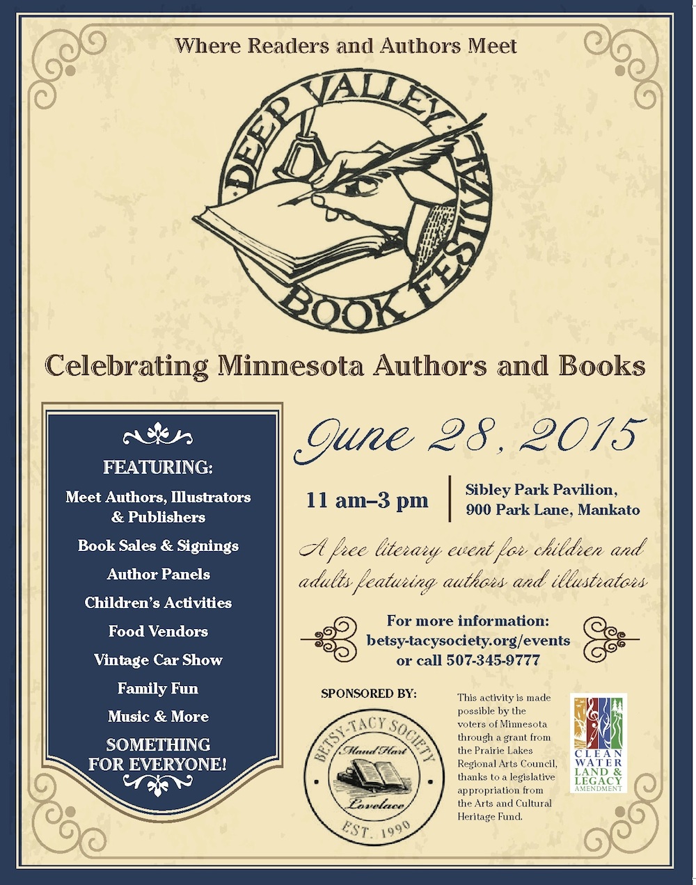 If you’re in Mankato on Sunday, I’d love to see you at the Deep Valley Book Festival, a celebration of Minnesota authors and books. We’re a pretty awesome bunch! Some amazing writing comes out of this place — what else can we do for months of the year when it’s bitterly cold outside? That gives us lots of time to write and think 🙂