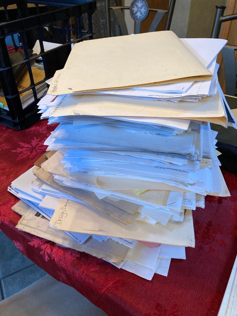 Most of this paper had to do with an early draft of my memoir. I probably don’t need a draft from 2007 anymore! I also had lots of comments from my writing group. Yeah, I think the time has passed to improve upon the manuscript! Yesterday I got rid of an equal amount of paper, plus an entire trash bag of stuff. I have a couple of more totes to go through.