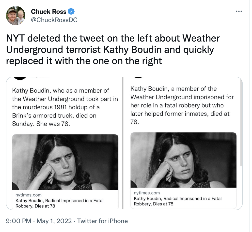 Obituaries are known for their glowing reports. From the small obituaries printed in my local newspaper to large, news-y obituaries like in the New York Times, there seems to be an obligation to remember the good and breeze past the bad. Eulogies, same thing. Here is the Kathy Boudin obituary.